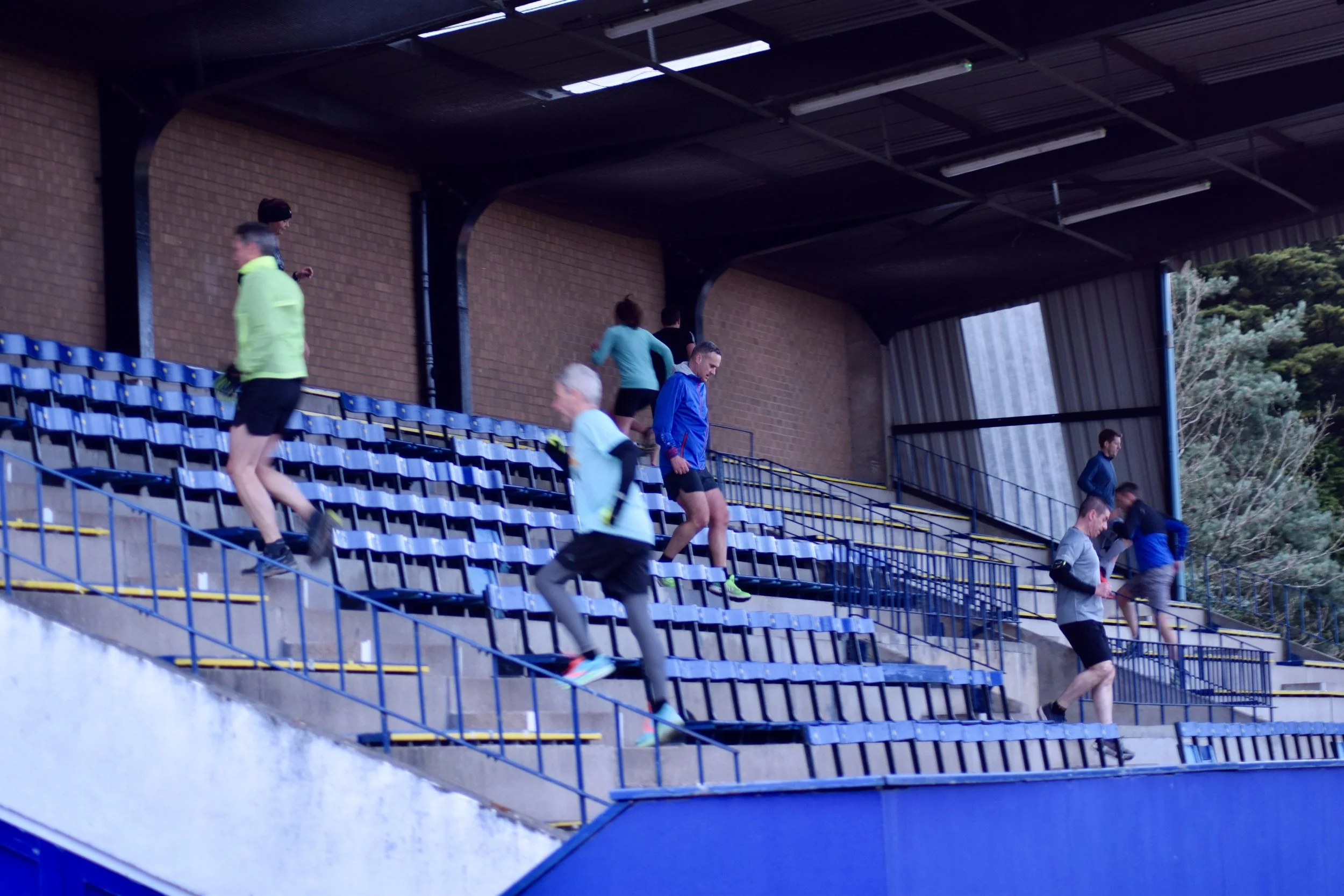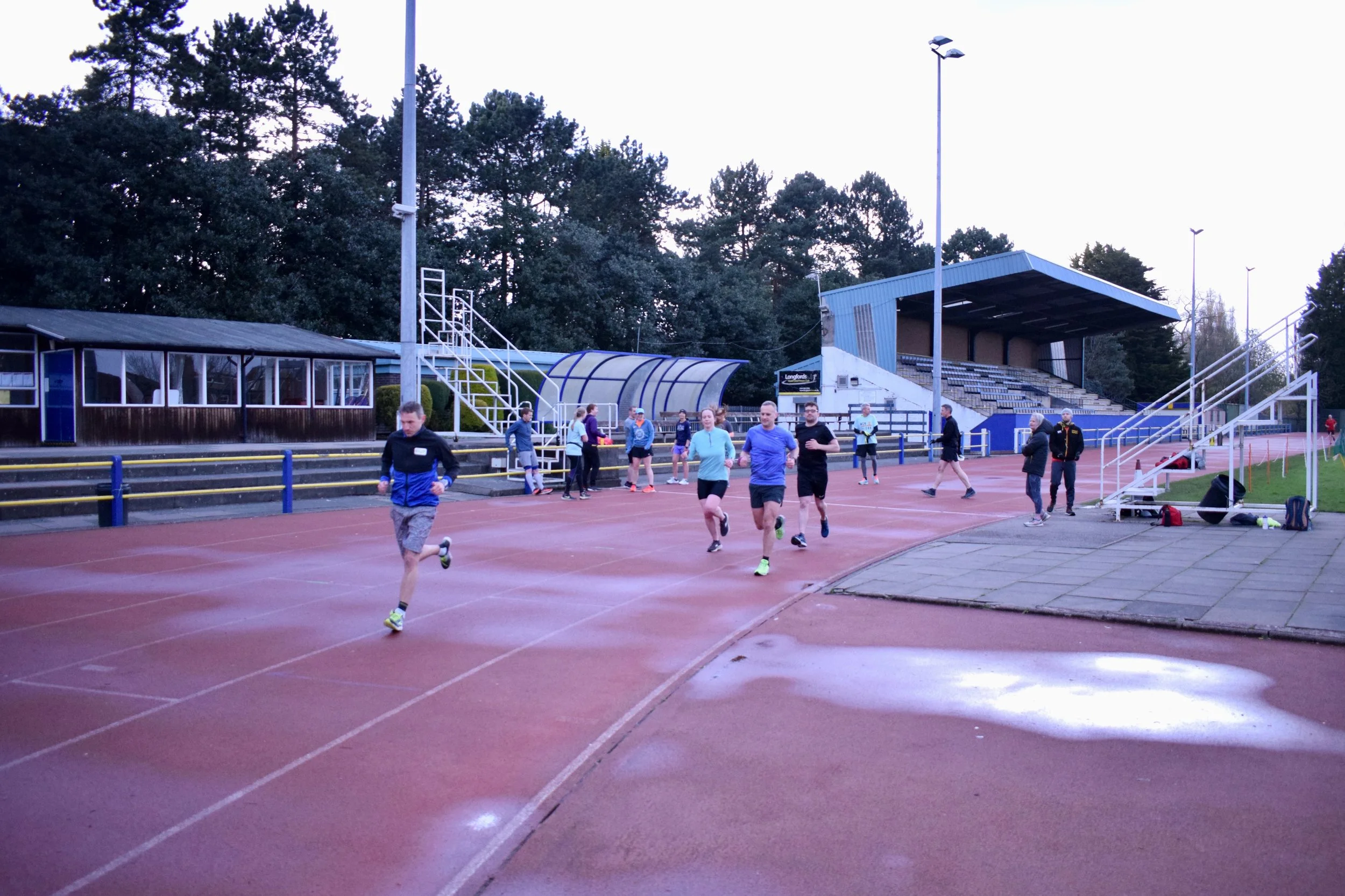 We work to structured interval sessions often to support training for upcoming races. After warming up with a few laps of the track and a few laps of the stadium seating runners will train for an hour on their top end speed and speed endurance.
