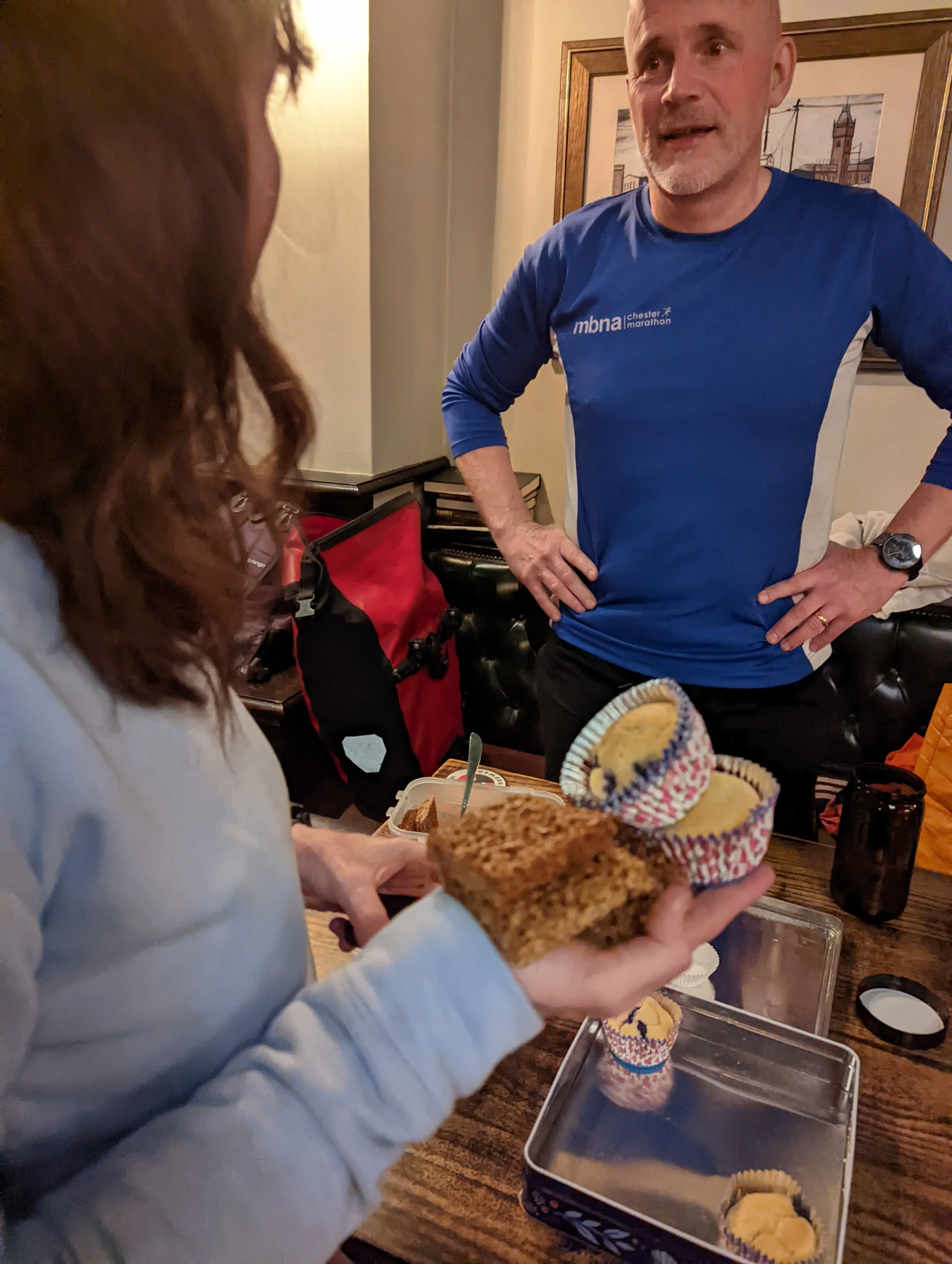 Inside you’ll find loads of people buying drinks, eating the free sandwiches and crisps, and enjoying the charity cake sale.